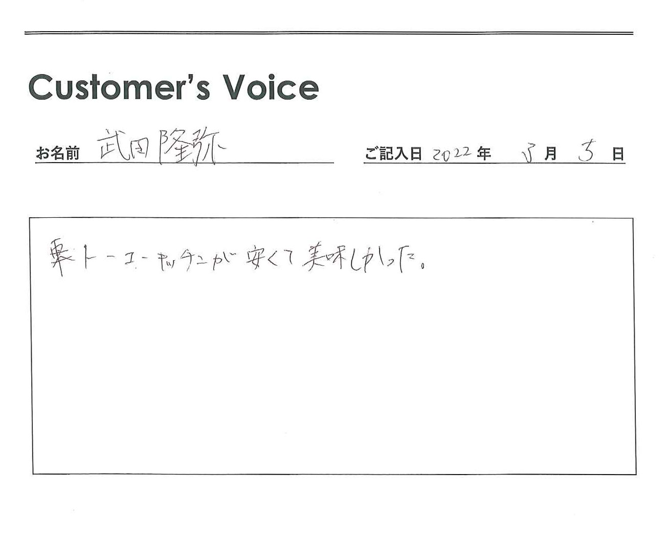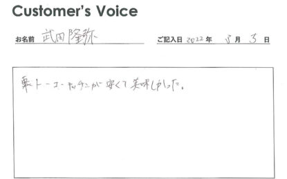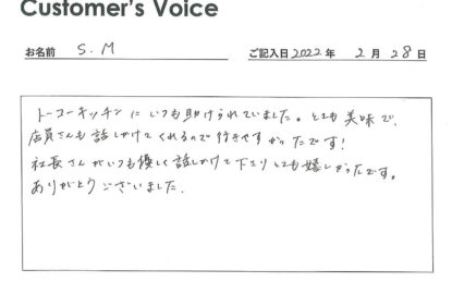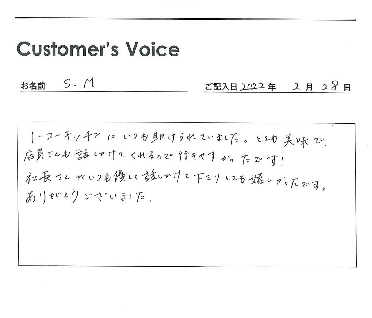 ◉こちらこそ、いつもトーコーキッチンを利用してくれてありがとう。Sさんと挨拶するのが日課だったから、これからさびしくなるよ。こっち方面に来たときには顔見せに来てね!(二代目より)