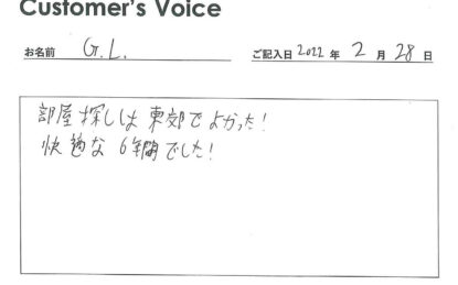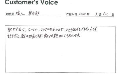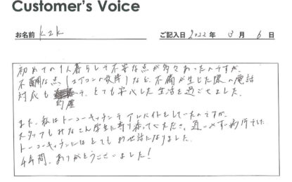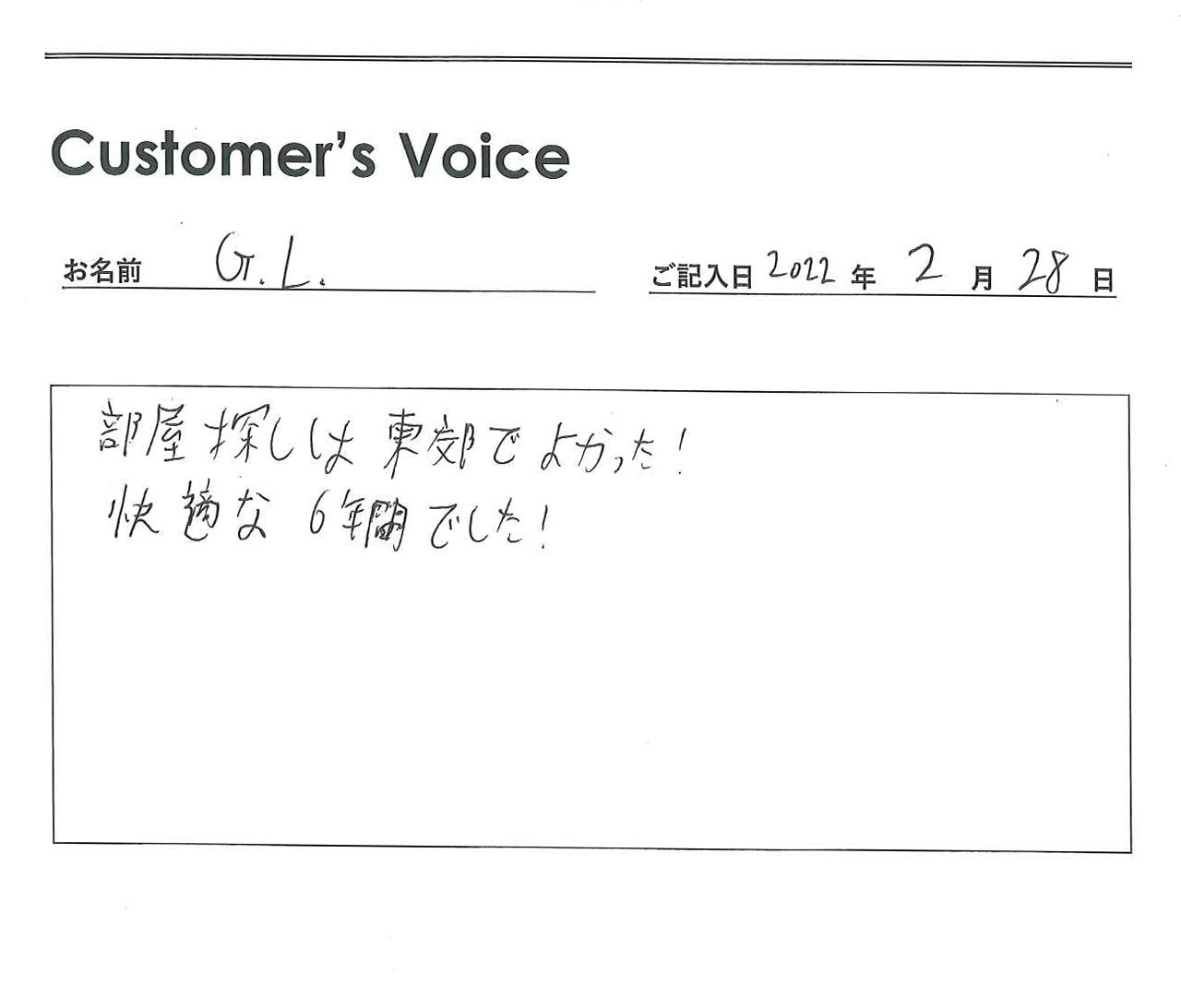 ◉Mさん、この度はご入居ありがとうございました。退室時にそのように仰っていただけて恐縮です。ぜひまたこちら側でお部屋探しの際にはご相談ください。新天地でもお元気で!(二代目より)
