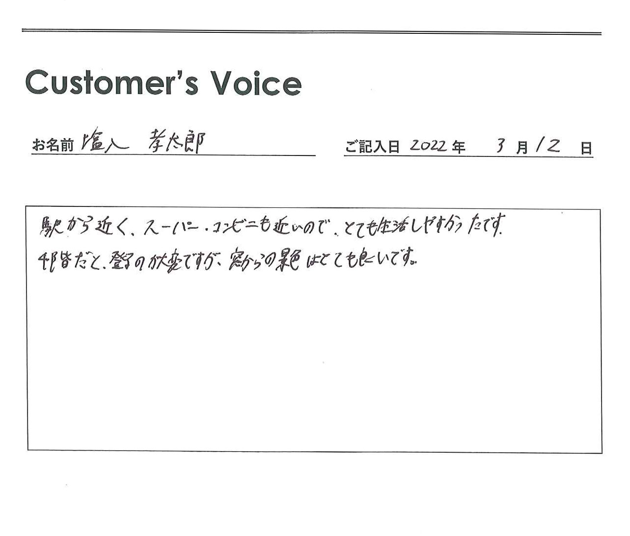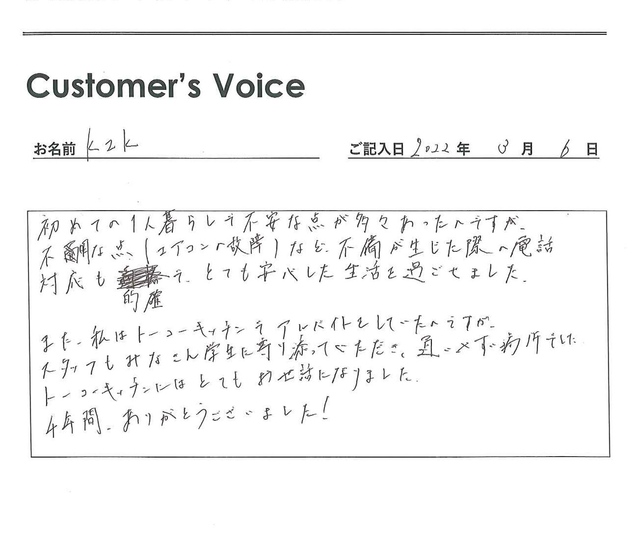 ◉塩入くん、卒業おめでとう。今回のメッセージをオーナーさんや、今後お部屋探しで同じ物件を検討する人にも元入居者の貴重な生の声として伝えさせてもらうね。ありがとう!(二代目より)