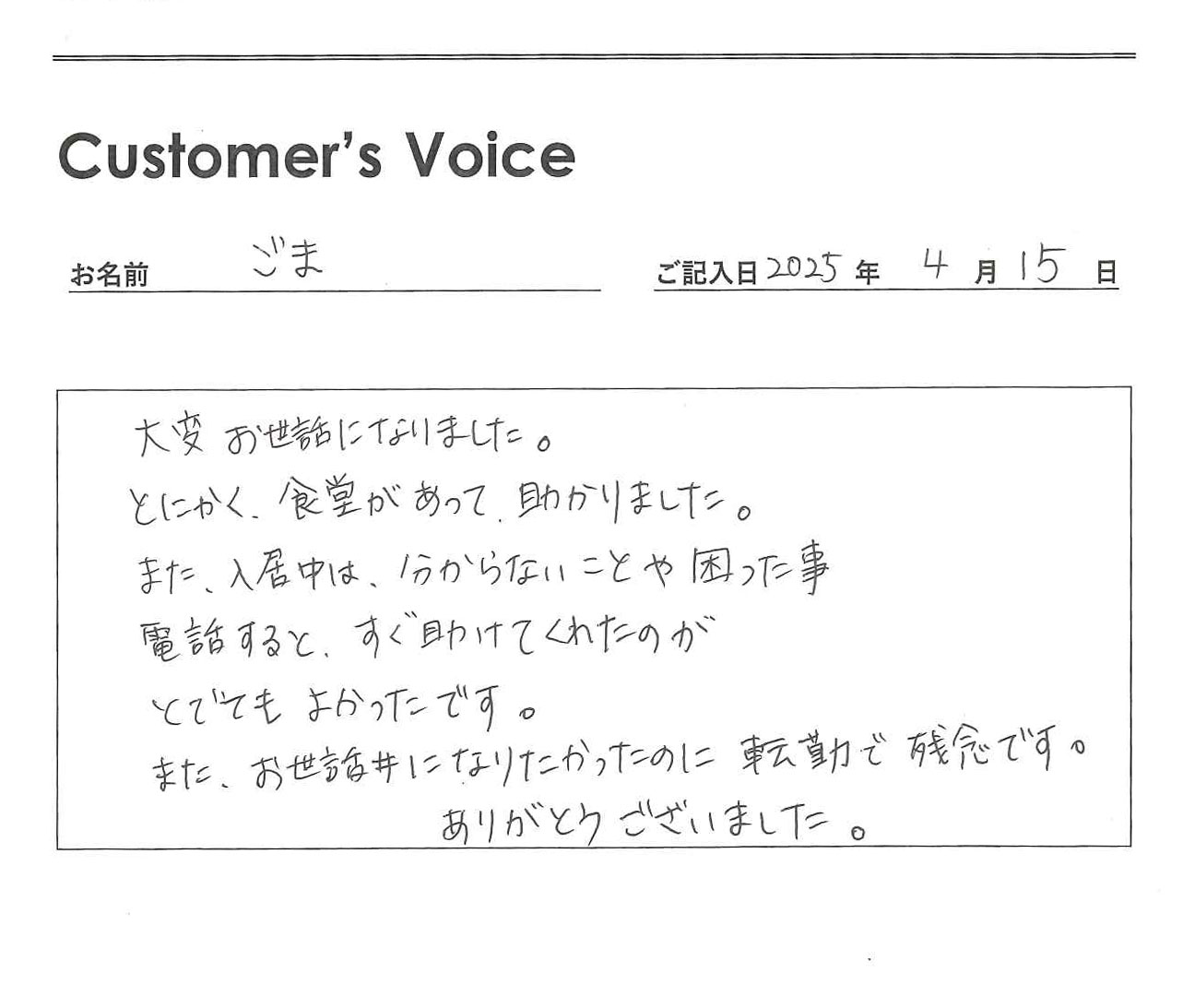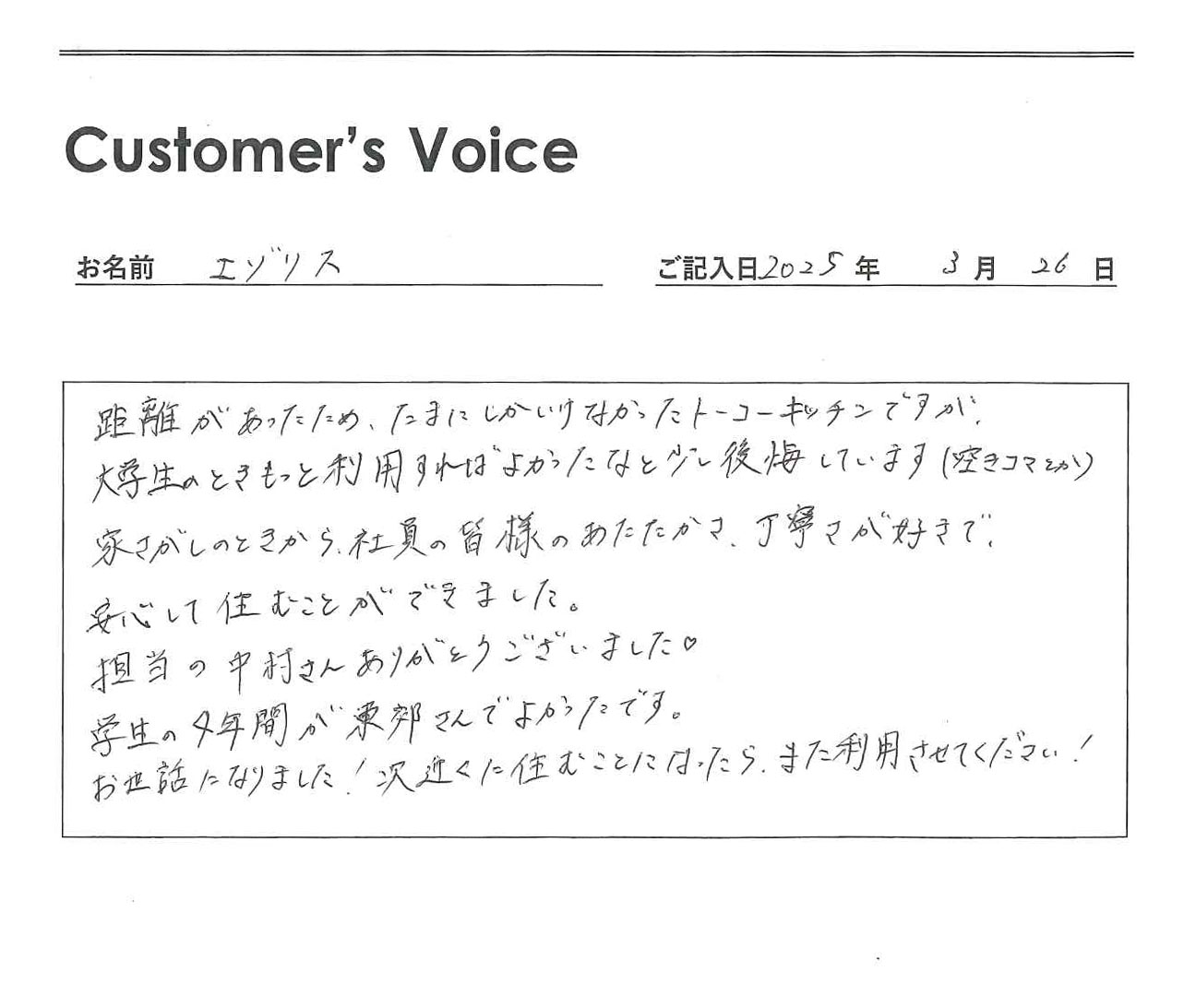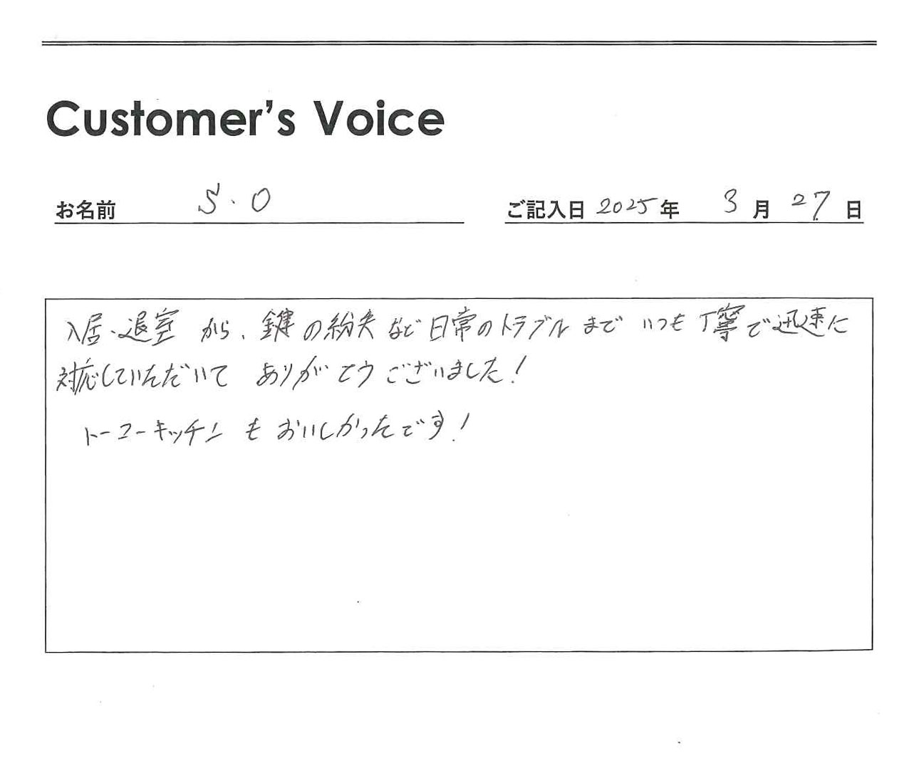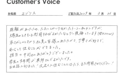 ◉Sさん、この度は東郊住宅社管理物件にご入居いただきありがとうございました。私たちにとってもSさんとのご縁に感謝しております。新天地でもお元気で頑張ってください!(二代目より)