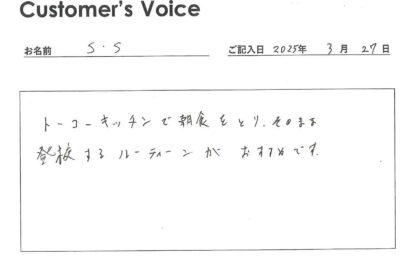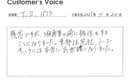 ◉トーコーキッチンを何百回も利用してくれてありがとう。また、不動産屋として強くオススメしてくれてありがとう。Yくんの言葉を励みにさせてもらい、これからも精進します!(二代目より)