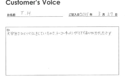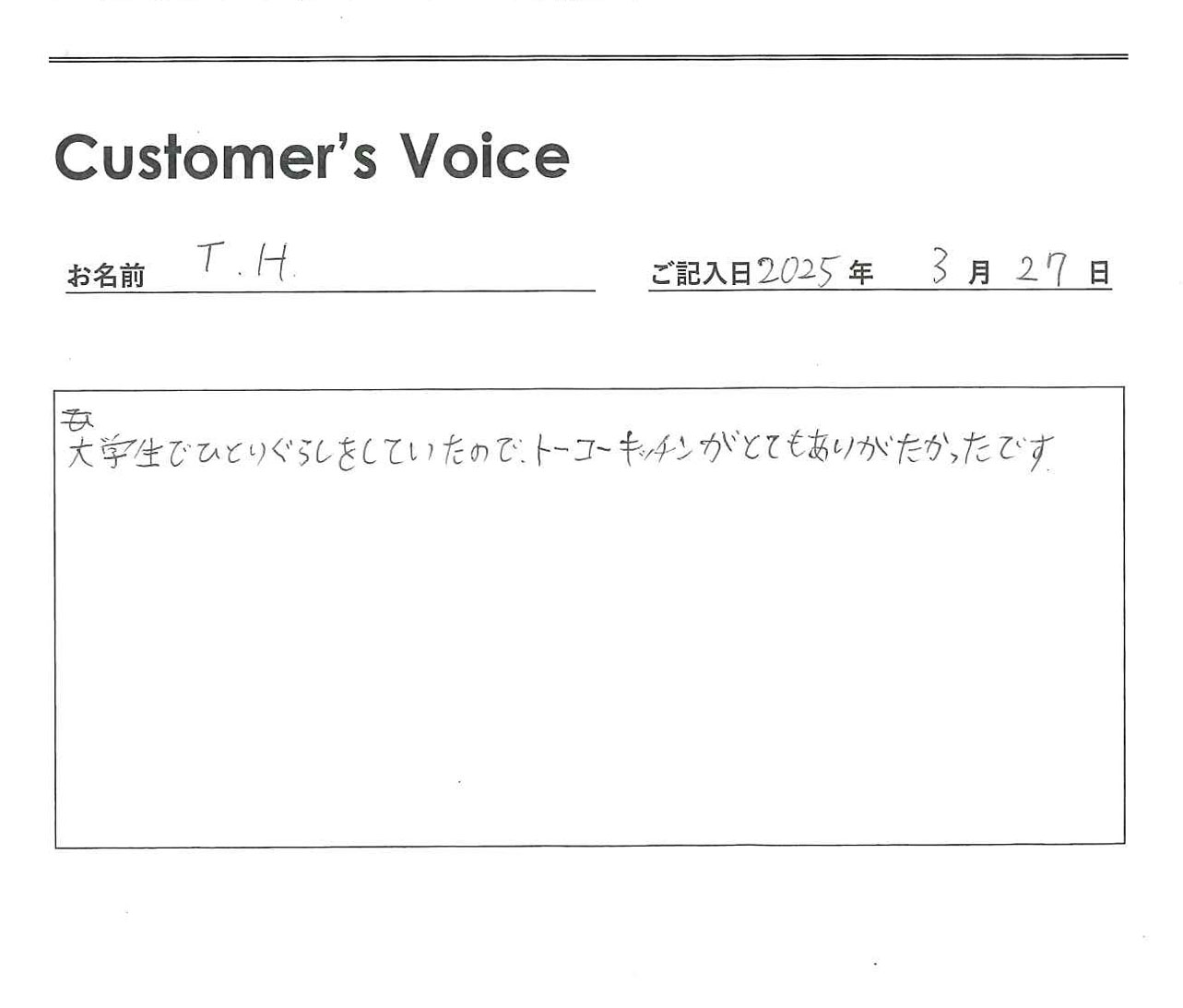 ◉住み替えも含めて、大学入学から卒業後に社会人としてと立派に活躍するまでの本当に長期にわたってトーコーキッチンを便利に使ってくれてありがとう。これからも元気でね!(二代目より)