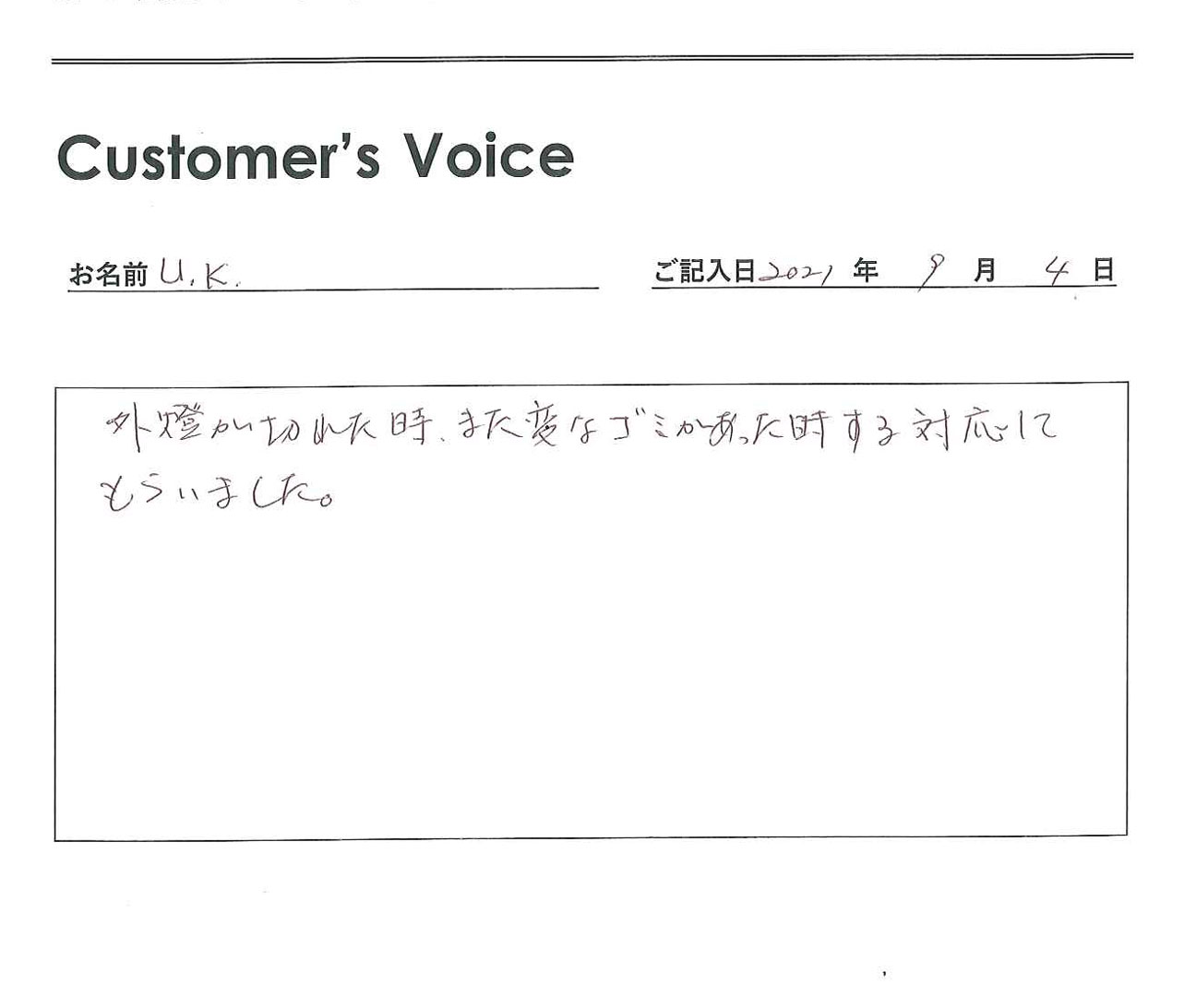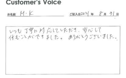 ◉こちらこそ、ご入居ありがとうございました。建物で不具合や異変があったときに即対応するのは当然の任務です。それより、すぐにお知らせくださったことに感謝です!(二代目より)
