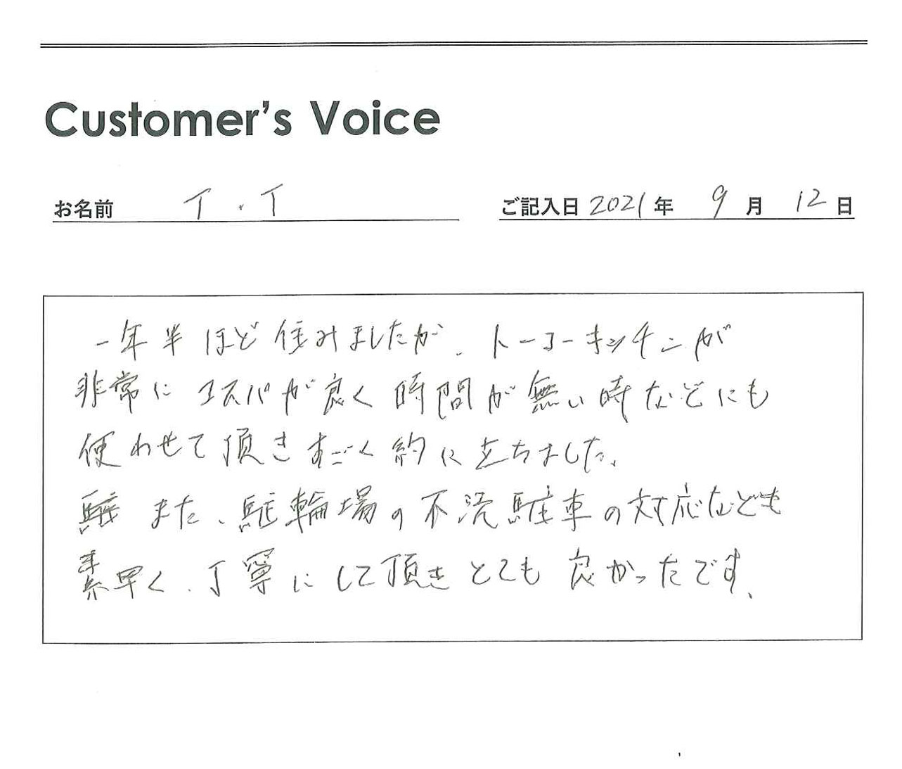 ◉Tさん、トーコーキッチンを便利にお使いただきありがとうございました。駐輪場の件ではご迷惑をおかけし申し訳ございませんでした。新天地でもお仕事頑張ってください!(二代目より)