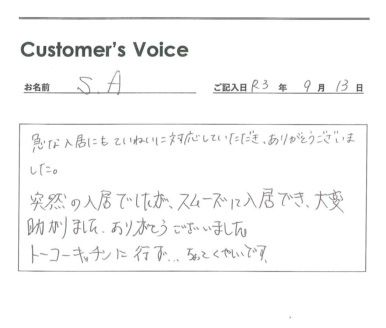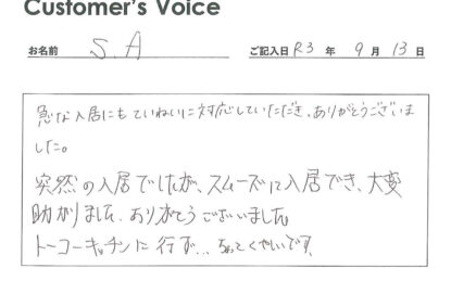 ◉こちらこそご縁をありがとうございました。スムースにご入居いただけて本当に安心しました。すばらしい新生活となりますよう、スタッフ一同、心からお祈り申し上げます!(二代目より)