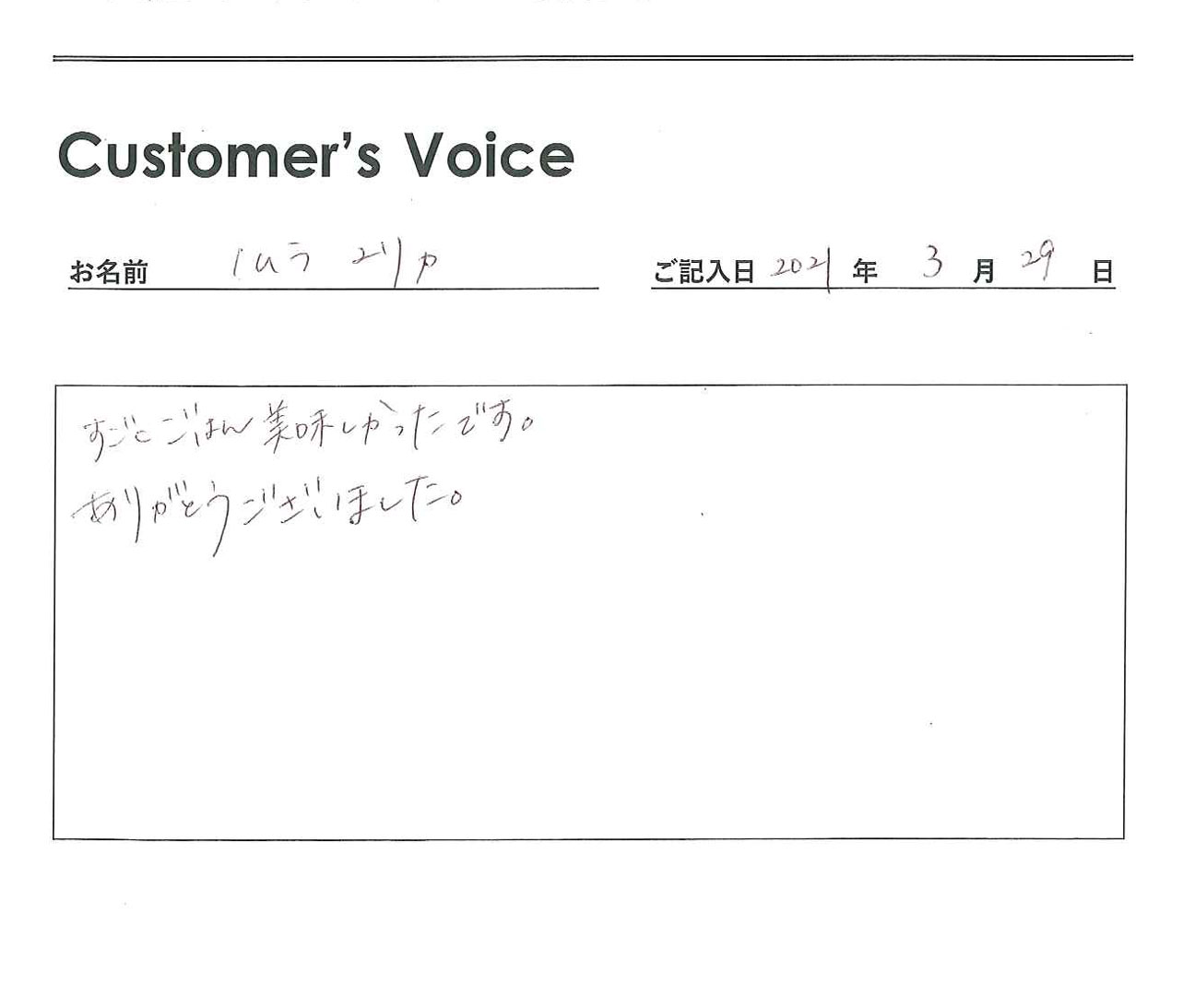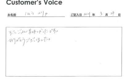 ◉ノムラさん、うれしいお言葉ありがとうございます。「美味しい」と言われるのが何よりもうれしい不動産屋としては、不動産屋冥利に尽きる思いです。また食べに来てね!(二代目より)