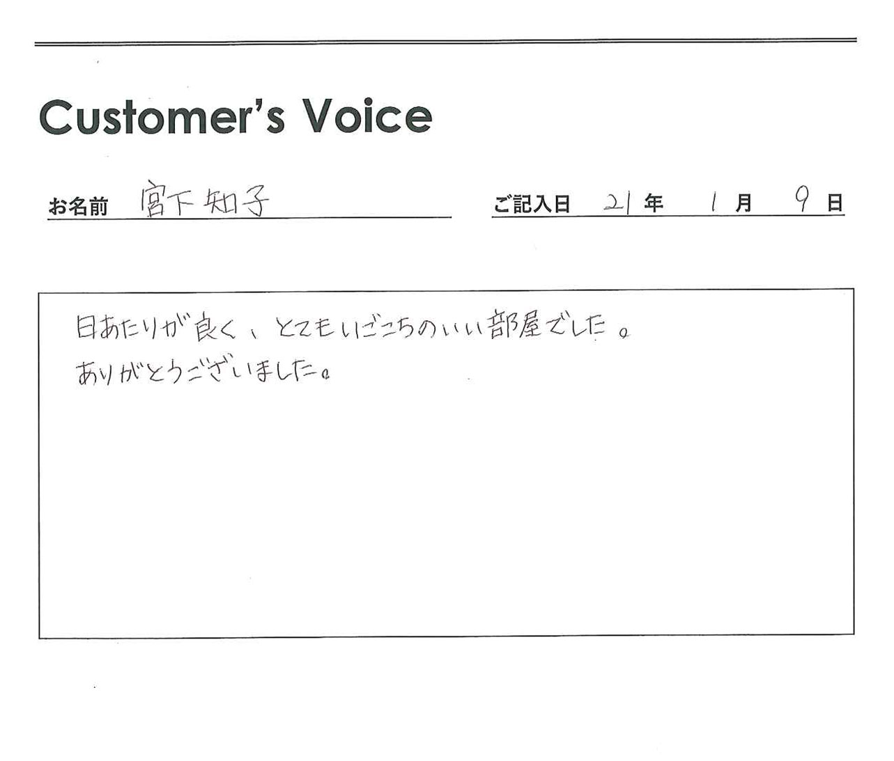 ◉宮下さん、長期ご入居ありがとうございました。お部屋をご満足いただけてよかったです。高層階で日当たり抜群ですもんね。オーナーさんにも伝えさせていただきます!(二代目より)