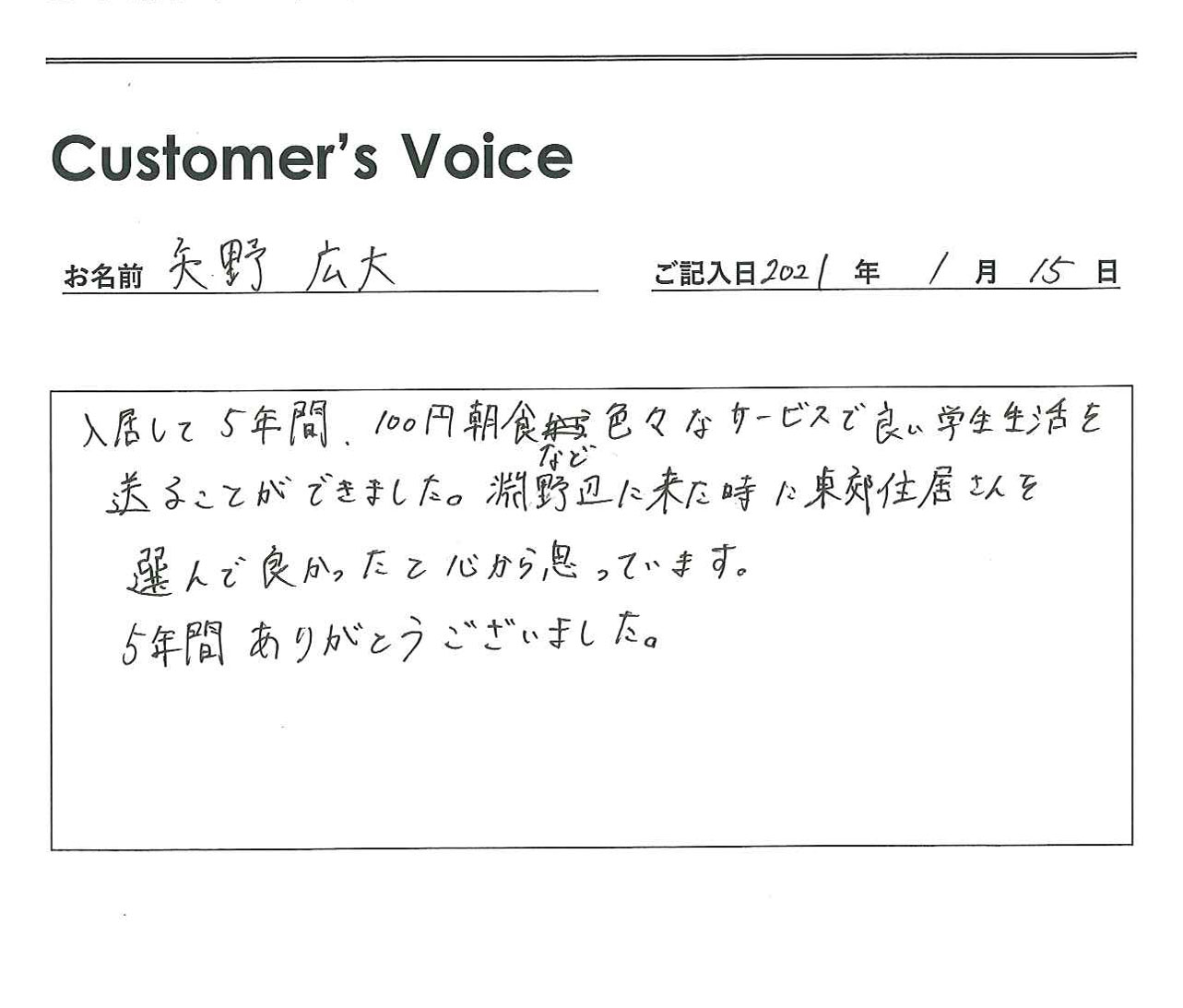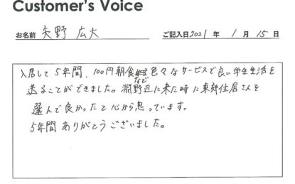 ◉矢野くん、こちらこそご縁をありがとう。リノベしてすぐの部屋を矢野くんがすごい気に入ってくれたことを思い出すよ。きれいに住んでくれてありがとう。頑張ってね!(二代目より)