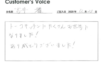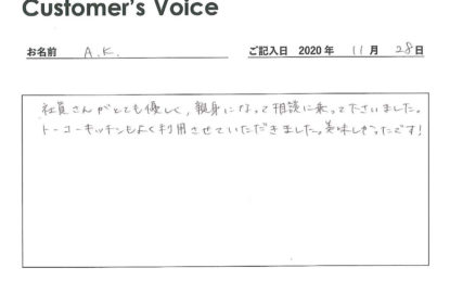 ◉Kさん、とんでもないです。ありがたいコメントに恐縮です。また、トーコーキッチンのご利用もありがとうございました。新天地での快適な暮らしをお祈り申し上げます!(二代目より)