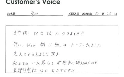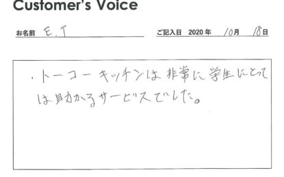 ◉トーコーキッチンがTくんの淵野辺での学生生活のお役に立てたなら心からうれしいです。物件からは少し離れているのにも関わらず、いつも利用してくれてありがとう!(二代目より)