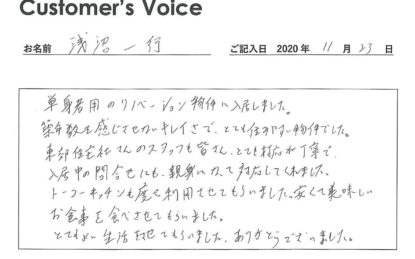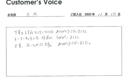 ◉Kさん、こちらこそ、この度はご入居いただきありがとうございました。また、物件からは少し距離があるのに、トーコーキッチンもご利用いただきありがとうございました!(二代目より)