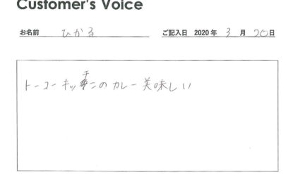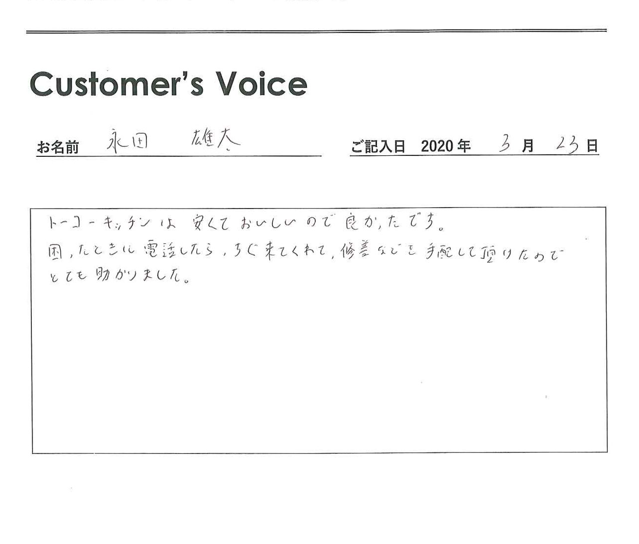 ◉永田くん、いつもトーコーキッチンを利用してくれてありがとう。また、当社の対応にもうれしいコメントありがとう。永田くんの役に立ててよかった。励みになります!(二代目より)