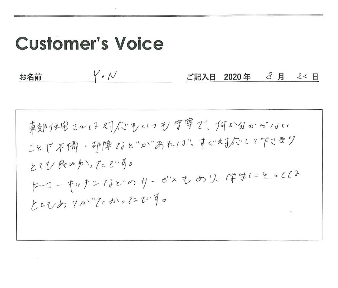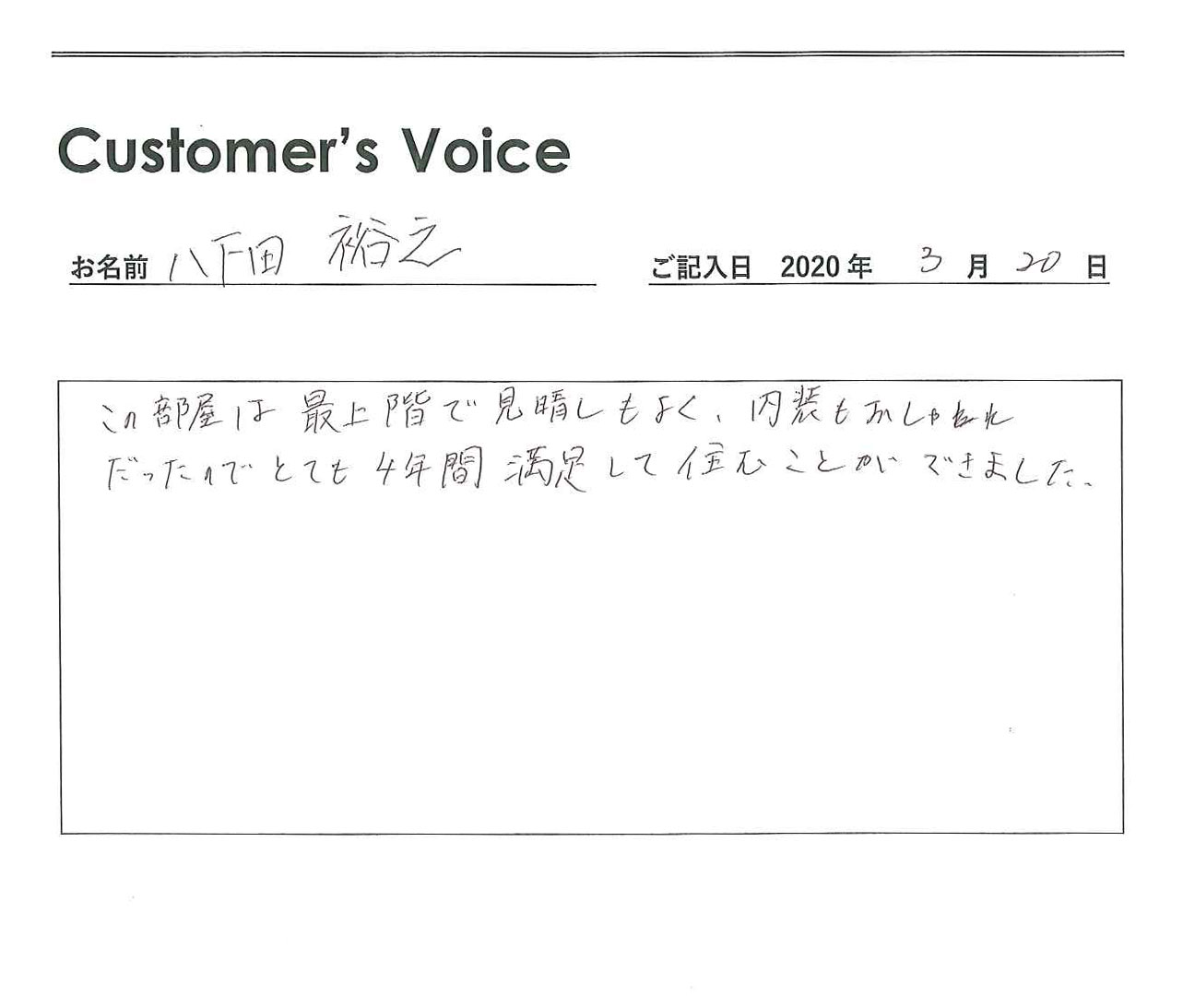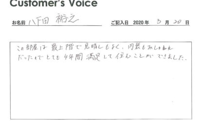◉八下田くん、こちらこそ4年間ご入居ありがとう。満足できる日々を過ごしてもらえてよかったです。オーナーさんも喜びます。新生活もすばらしいものとなりますように!(二代目より)
