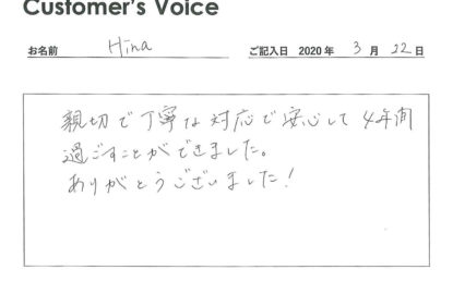 ◉Hinaさん、こちらこそ4年間のご入居ありがとうございました。安心して過ごしてもらえたとの言葉が聞けて、ボクたちこそ安心しました。新天地でもますます頑張ってね!(二代目より)
