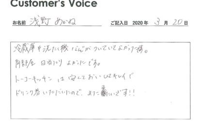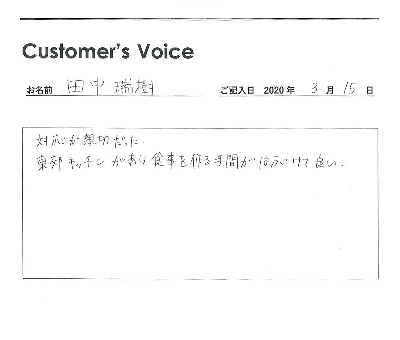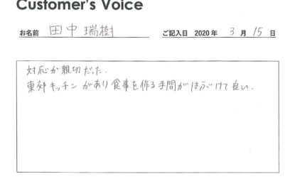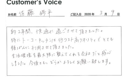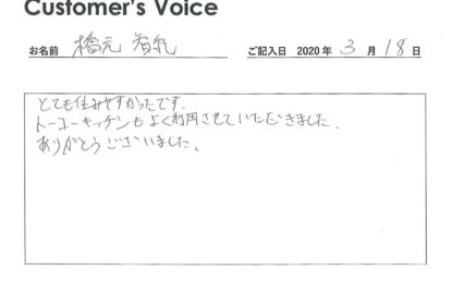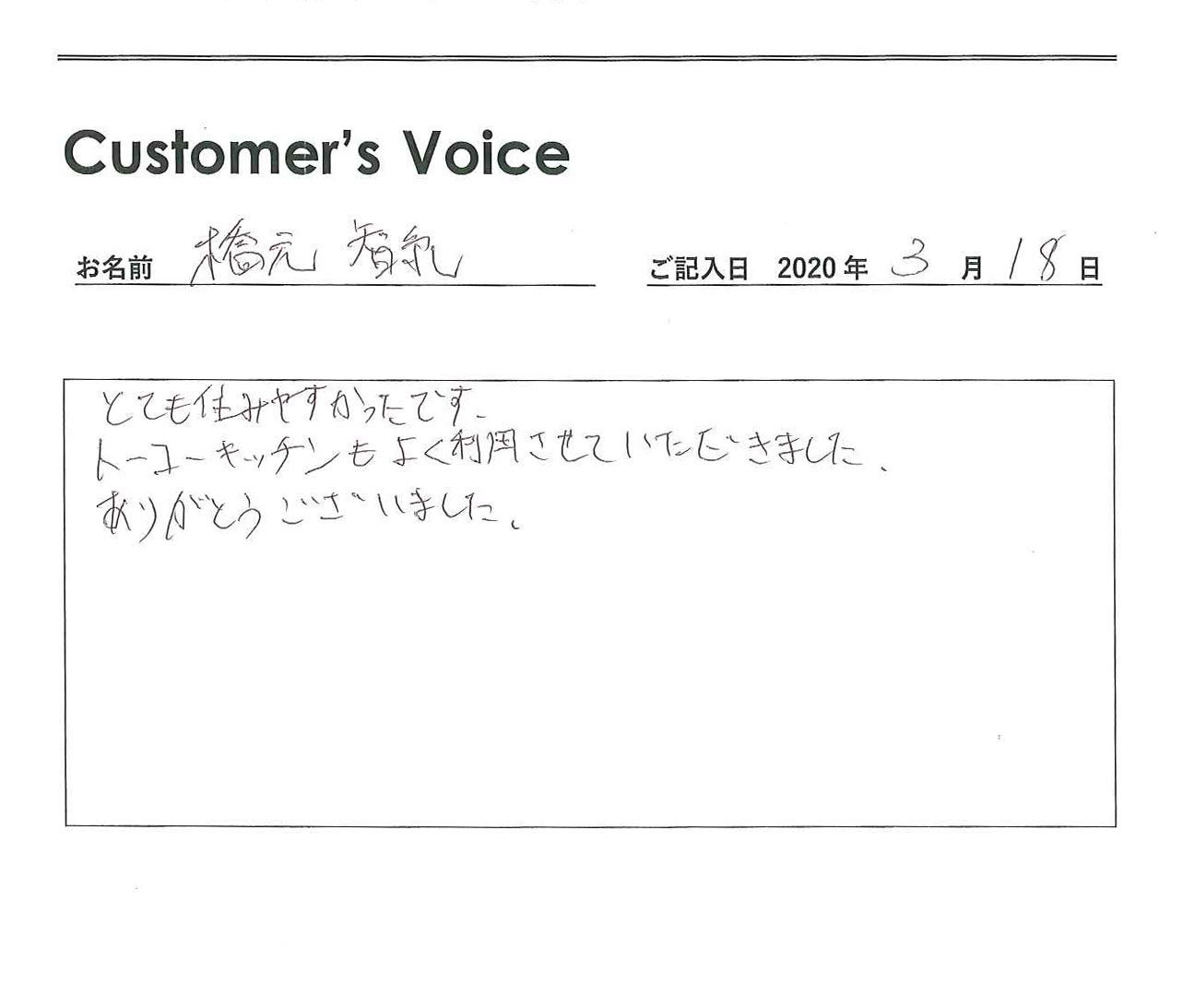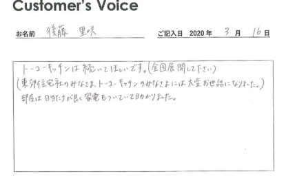◉住みやすかったと言ってもらえてよかったです。オーナーさんも喜ぶので、橋元くんの言葉を伝えさせてもらいます。トーコーキッチンも利用してくれて本当にありがとう!(二代目より)