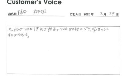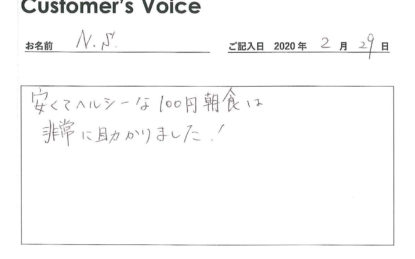 ◉持丸くん、いつもトーコーキッチンご利用ありがとう!「学生としてありがたかった」なんて、うれしすぎる言葉だよ。ありがとう。新天地でも朝ごはんきちんと食べてね!(二代目より)