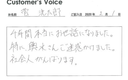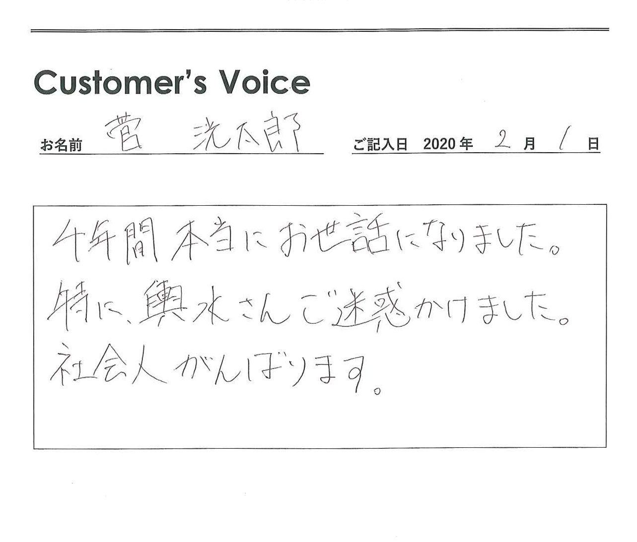 ◉菅くん、就職おめでとう! 本当にいろいろなことがあったよねー笑 でも、いなくなってしまうと寂しくなるよ。こちら方面に来ることがあったら、顔を見せに来てね!(二代目より)