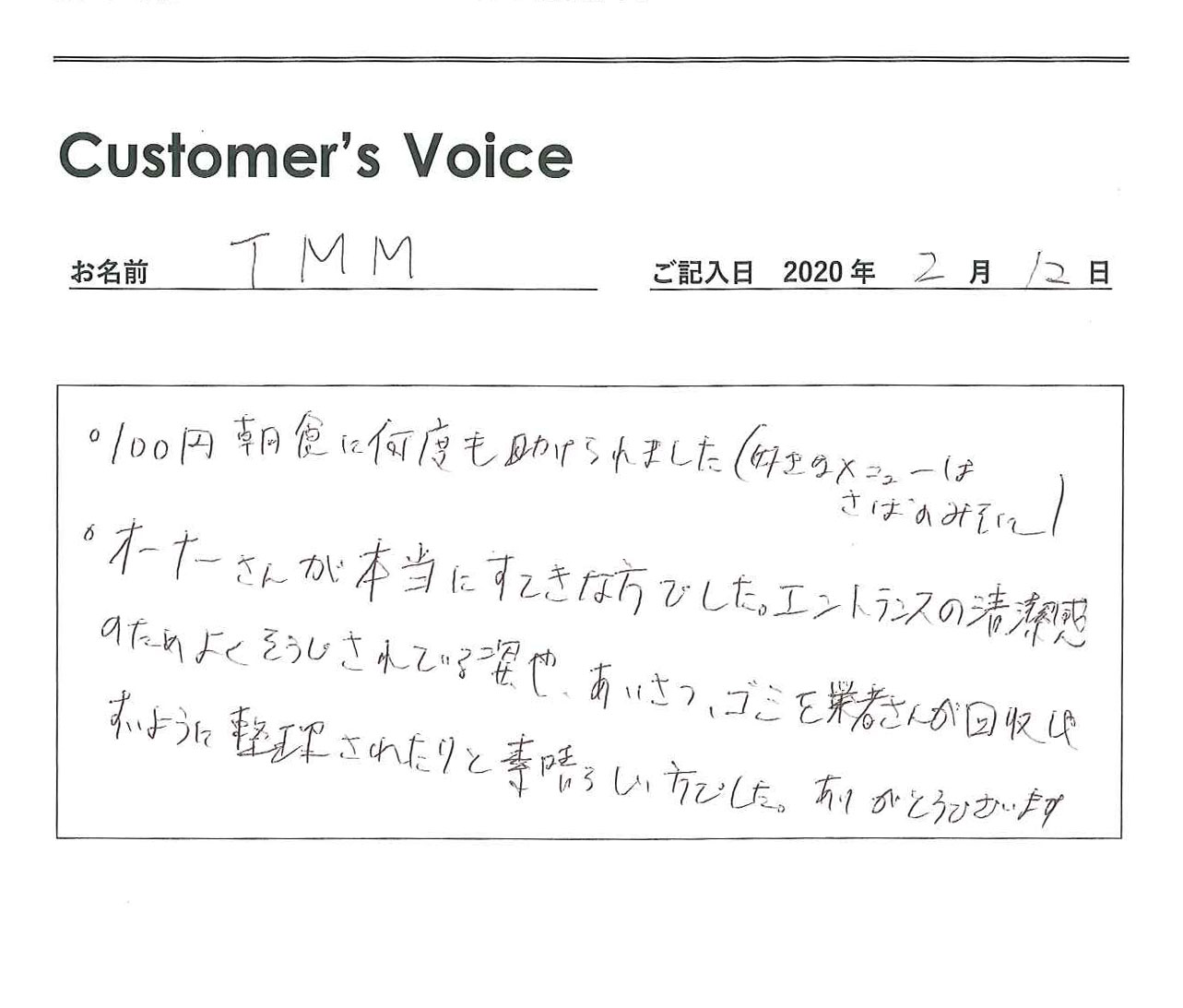 ◉100円朝食がお役に立てたようで良かった! そして、オーナーさんへのメッセージもありがとう。TMMくんからの御礼を伝えさせてもらうね。うれしくって泣いちゃうかも!(二代目より)