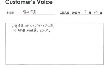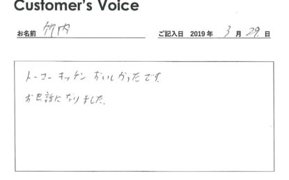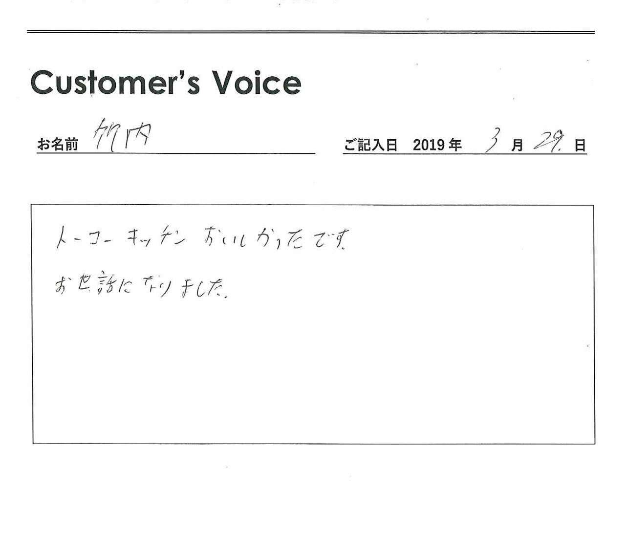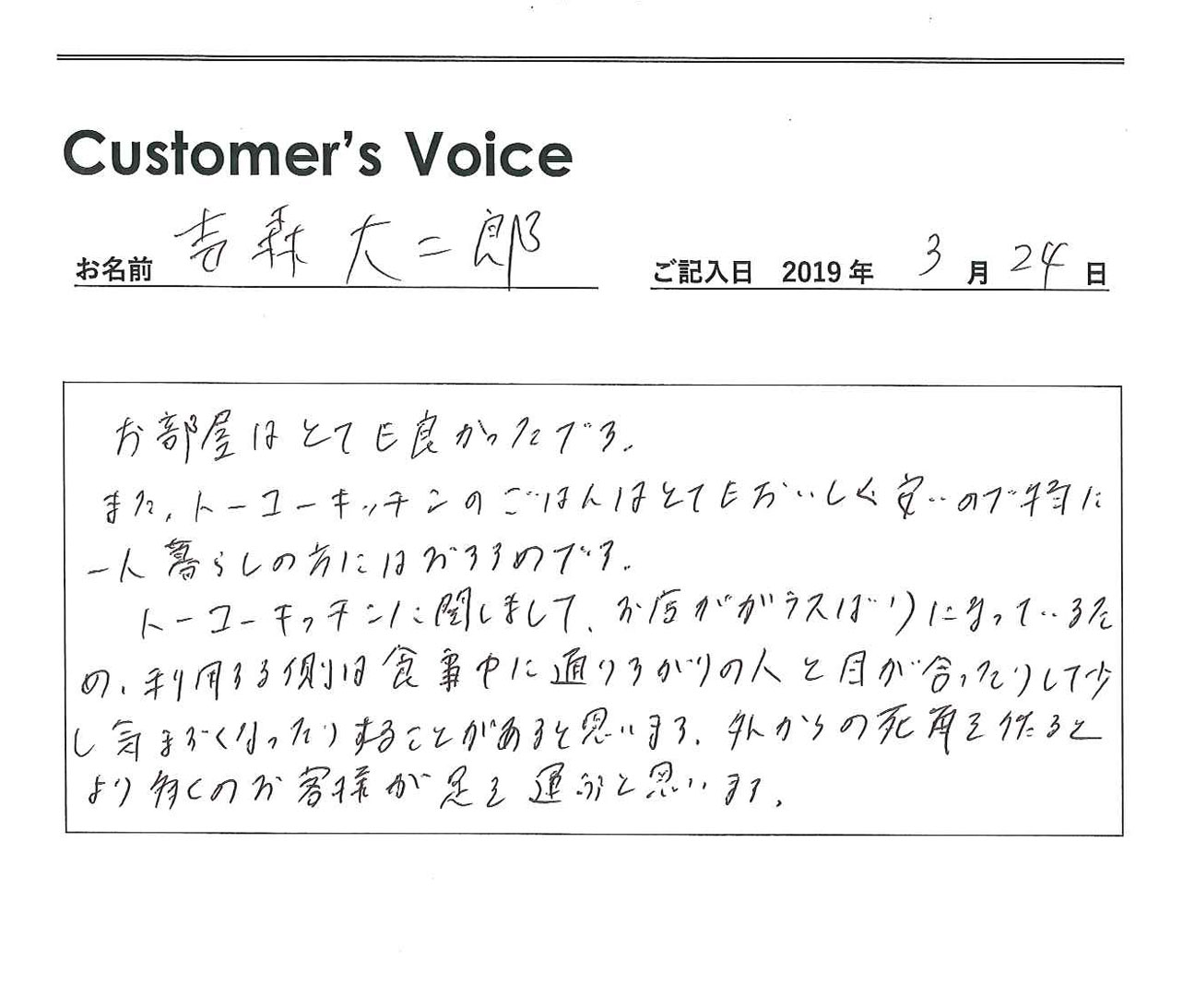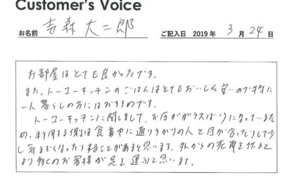 ◉吉森くん、きれいに部屋を使ってくれてありがとう。トーコーキッチンから少し離れた物件なのに贔屓にしてくれてありがとう。そして、貴重なアドバイスもありがとう!(二代目より)