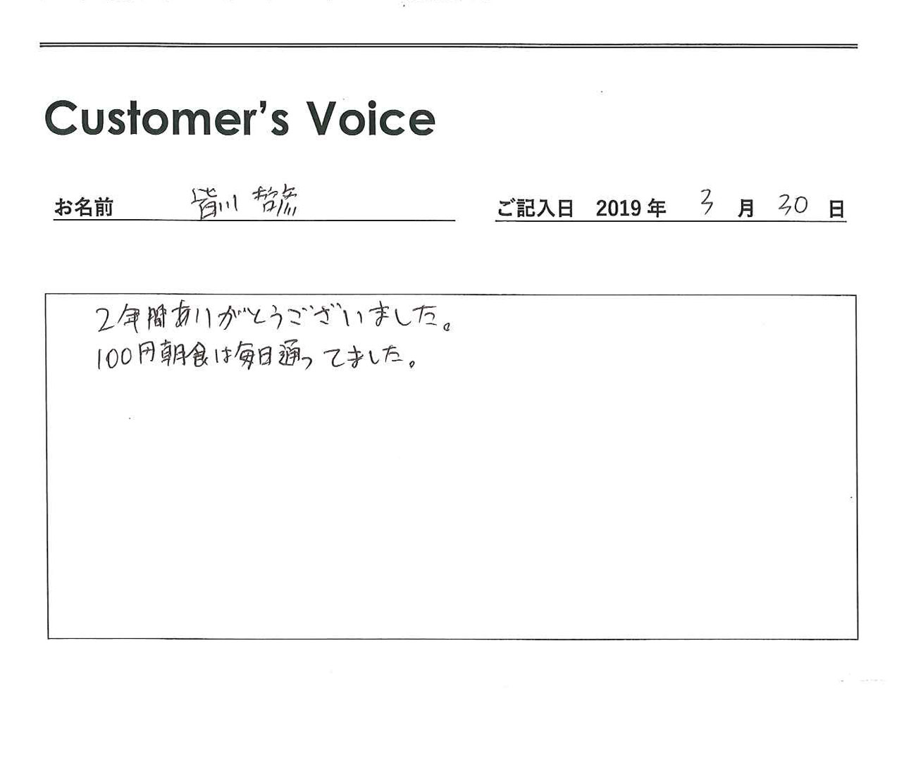 ◉こちらこそご贔屓にありがとう。皆川くんを朝見かけなることがなくなってしまうのはさびしいけど、卒業おめでとう。新生活になっても朝ごはんをしっかり食べてね!(二代目より)
