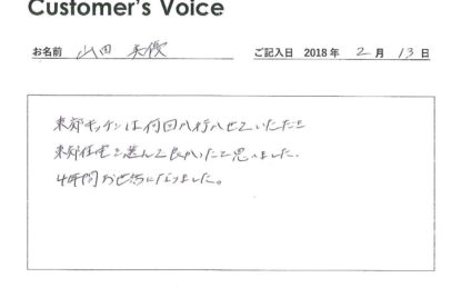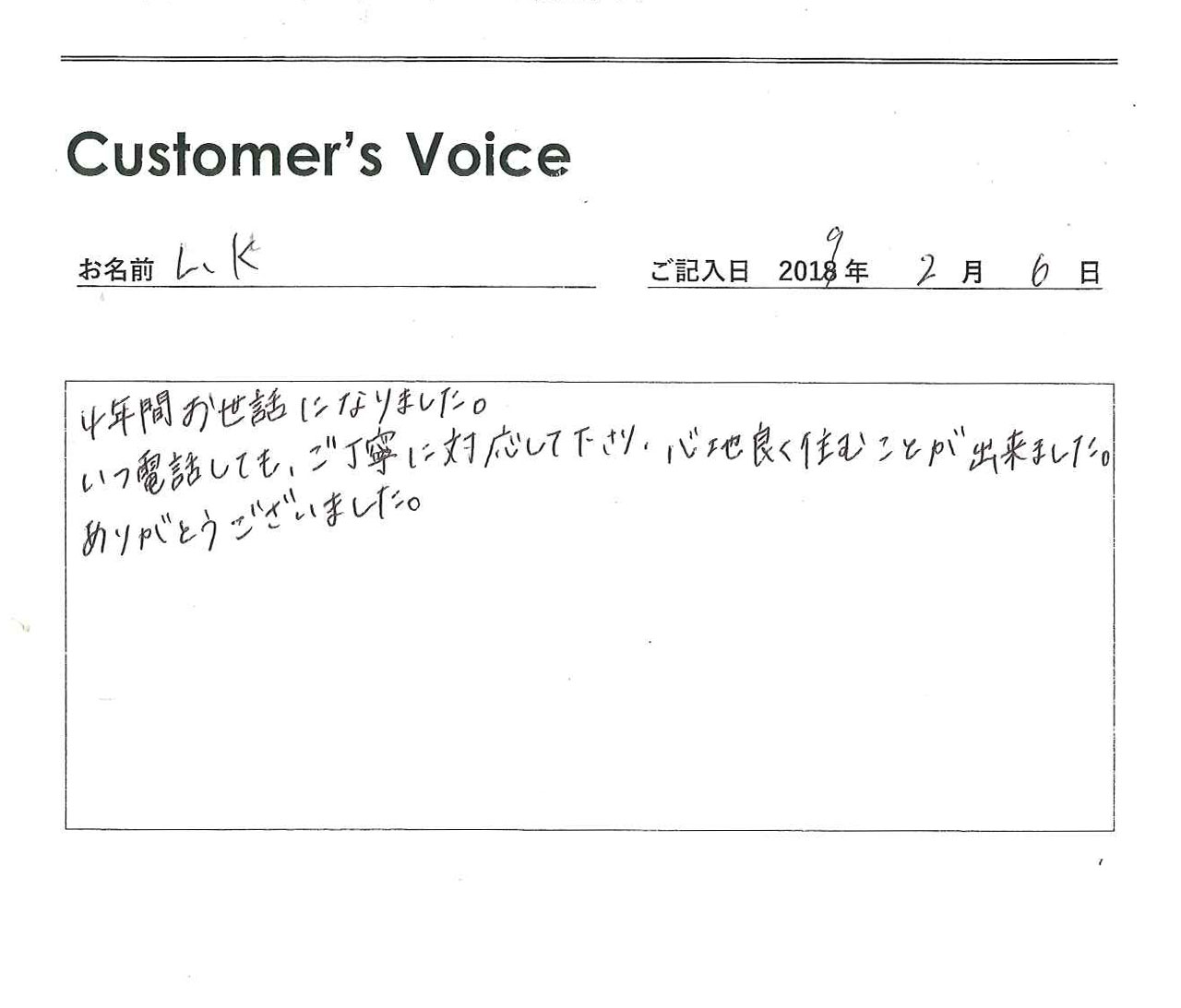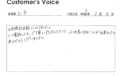 ◉こちらこそ、4年間ありがとう。安心安全な心地よい暮らしを提供し続けるのが当社の責務です。Kさんにそう言ってもらえて励みになります。新天地でも頑張ってね!(二代目より)