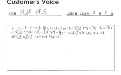◉なんてうれしいコメントを! ありがとう。スタッフ一同、渡邉くんの言葉を励みにこれからも精進するので、渡邉くんも新生活頑張ってね。たまには遊びにおいでよ!(二代目より)