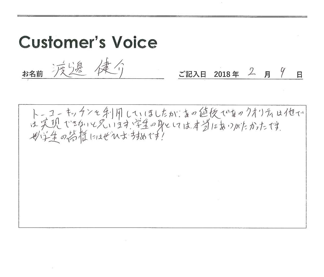 ◉こちらこそ、いつも利用してくれてありがとう。トーコーキッチンのビジネスモデルは堂ノ下くんの勉学に役立ったかな? 淵野辺に来た際には気軽に顔を出してね!(二代目より)