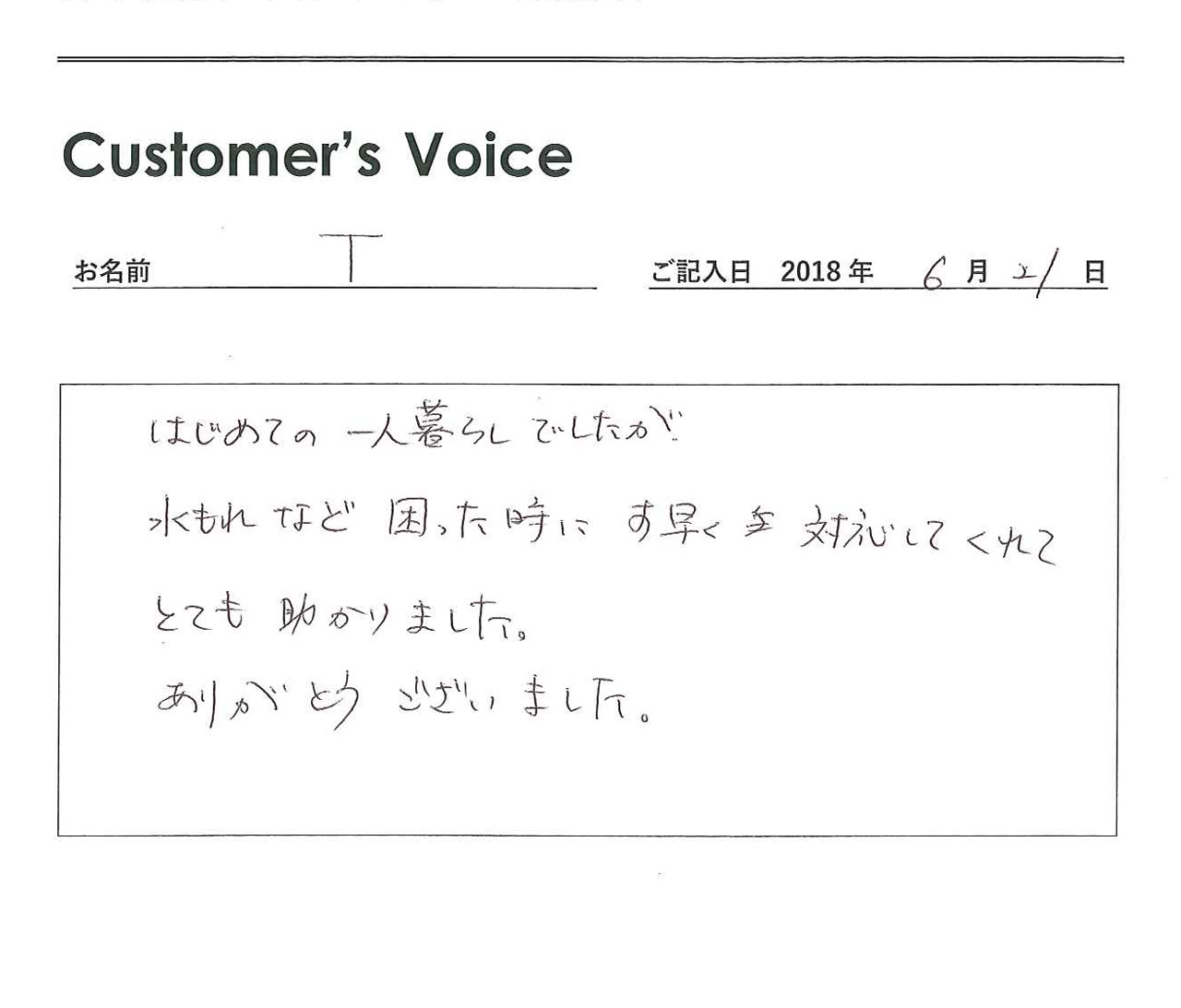 ◉こちらこそ、ありがとうございます。Tさんが初めての一人暮らしでも毎日安心して過ごせるように私たちがそっと寄り添えていたならば、不動産屋冥利に尽きます!(二代目より)