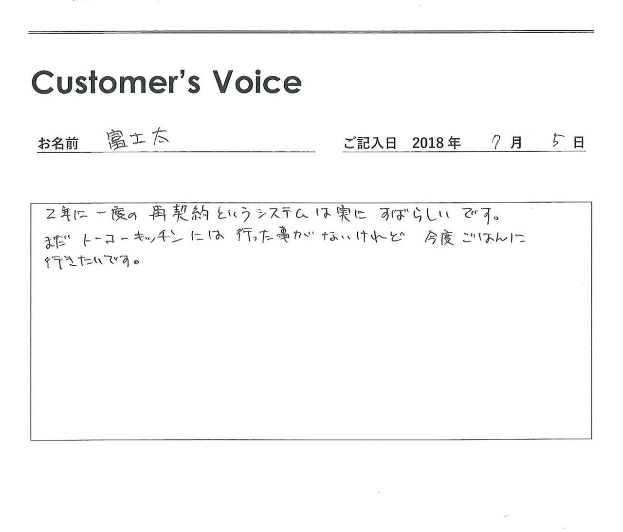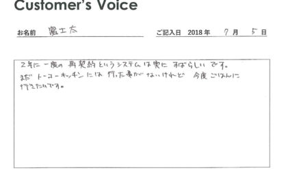 ◉富士太さん、再契約ありがとうございます。永く安心・安全・快適に暮らし続けていただけるとうれしいです。トーコーキッチンもぜひご家族でご利用ください!(二代目より)