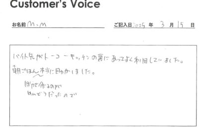 ◉ありがとうございます。お勤めの方にそう仰っていただけると、トーコーキッチンを始めてよかった感がグッと増します。励みにさせていただき、これからも精進します!(二代目より)