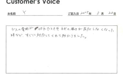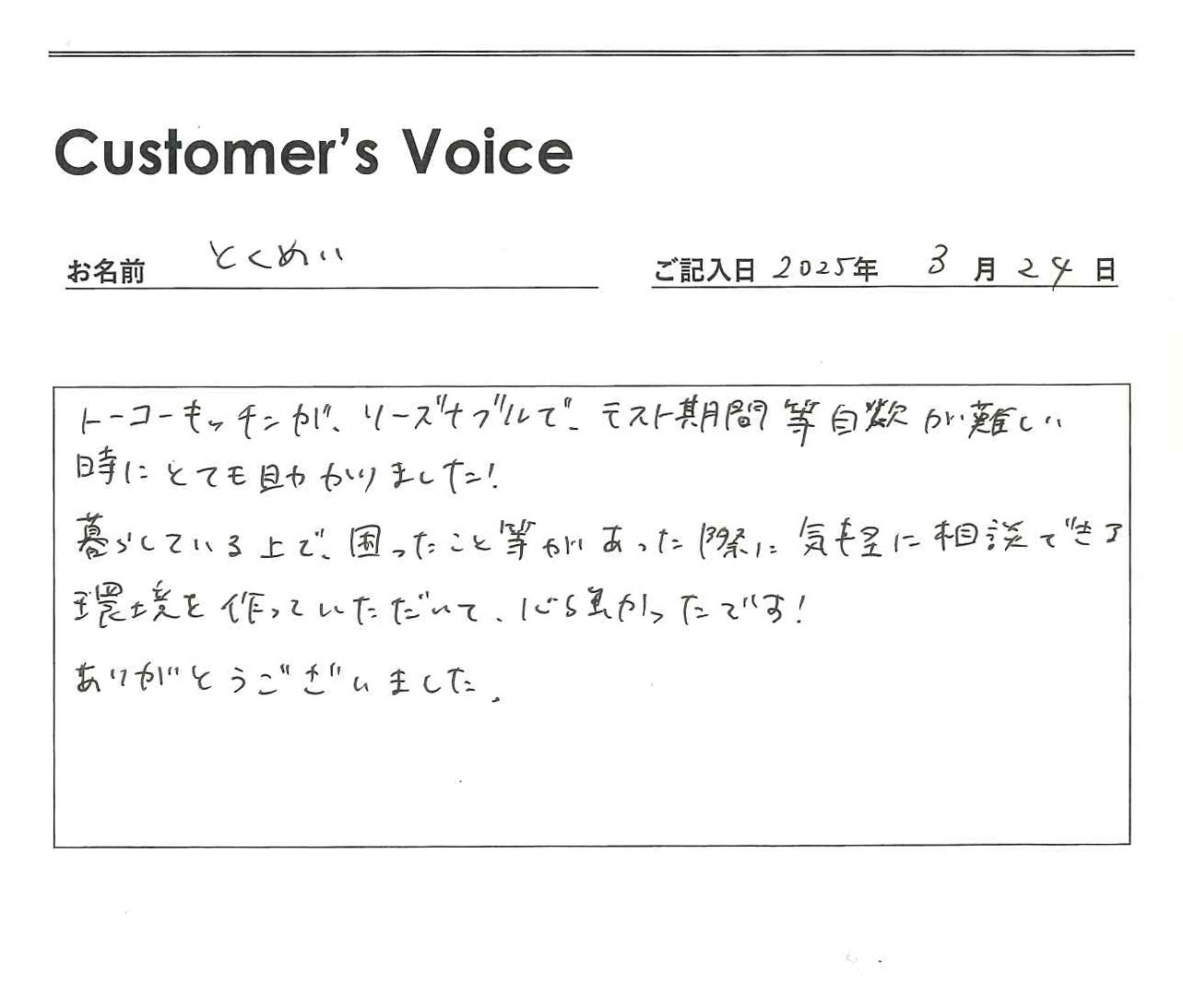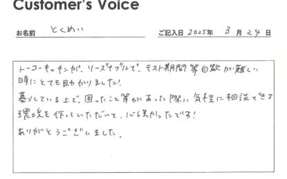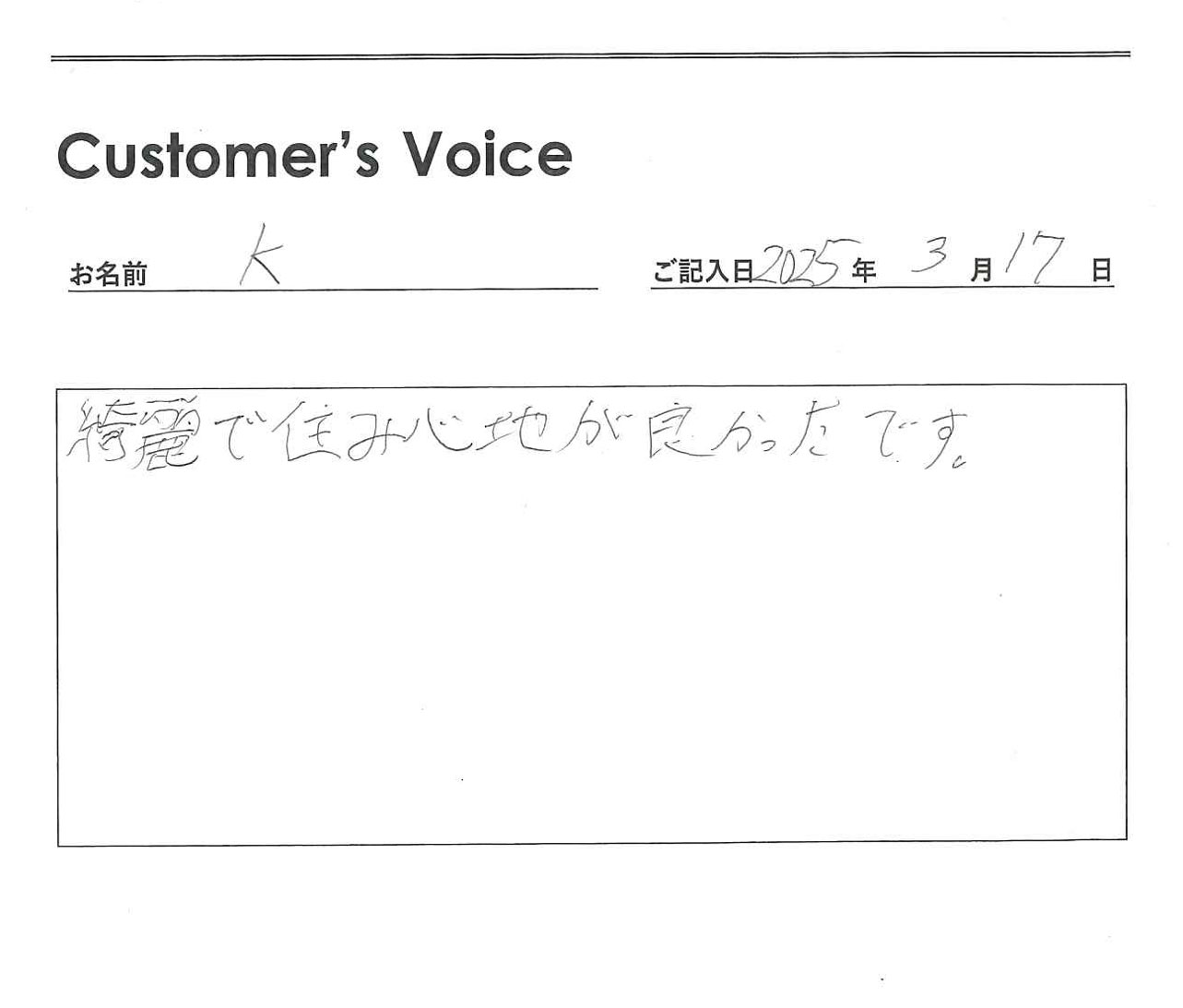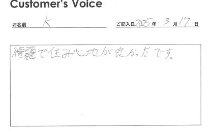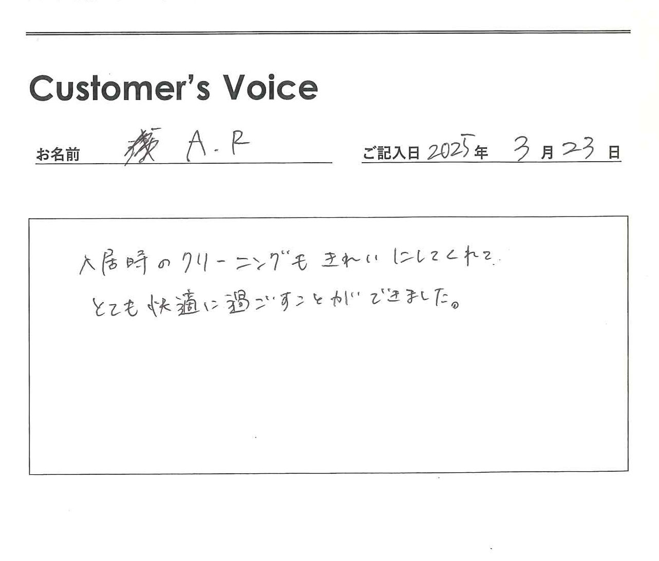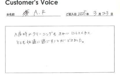 ◉Aさん、快適に過ごしてもらえたとのこと、よかったです。クリーニングも満足してもらえたようで安心しました。新天地での新生活も、Aさんなら大丈夫。応援してます!(二代目より)