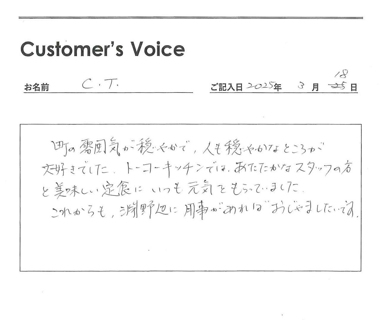 ◉こちらこそ、Tさんの爽やかな笑顔にいつも元気をもたっていました。寂しくなってしまうけど、淵野辺方面に来たときは顔を出してね。再会を楽しみにしてます。元気でね!(二代目より)