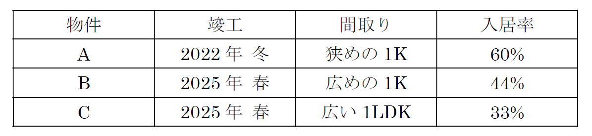 2024年秋~冬の竣工にも関わらず満室になっていない物件が散見され、中にはまだ1~2室しか入居が決まっていない物件もあるようでした。以下、一部ですが、国公立大学後期日程の合格発表開始日の3月20日時点の数字です。いずれも淵野辺駅徒歩10分圏内の物件で、賃料は低い順にA→B→Cとなります。