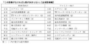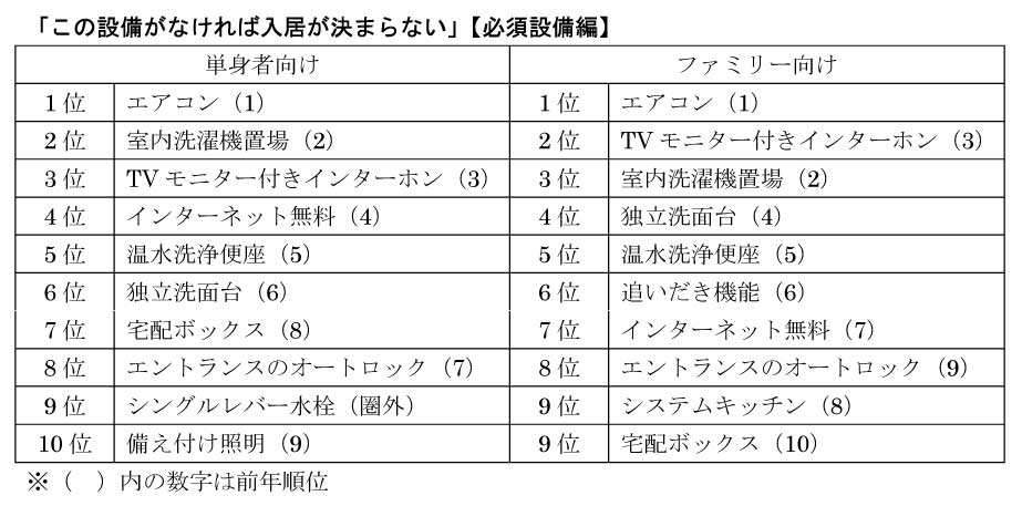 弊社の回答は1位の「エアコン」のみです。2~10位の設備は無くても入居は決まります。単身者向け5位の「温水洗浄便座」を希望される方は年々増えていますが、「自身で取り付けられれば(トイレにコンセントがあれば)OK」という方がほとんどです。