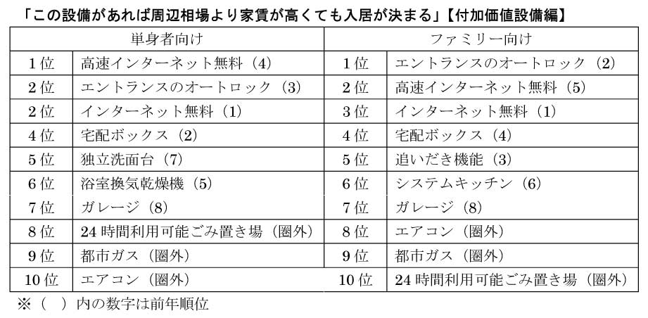 ご時世から、節約・安全に直結する設備は訴求力が特に強まっていると感じられます。今回、単身者向け・ファミリー向けの両方で圏外からランクインした「都市ガス」は象徴的です。また、「高速インターネット無料」が「インターネット無料」の上位に浮上したのも注目です。
