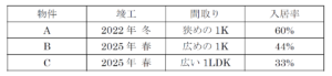 2024年秋~冬の竣工にも関わらず満室になっていない物件が散見され、中にはまだ1~2室しか入居が決まっていない物件もあるようでした。以下、一部ですが、国公立大学後期日程の合格発表開始日の3月20日時点の数字です。いずれも淵野辺駅徒歩10分圏内の物件で、賃料は低い順にA→B→Cとなります。
